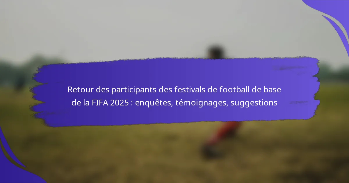 Les retours des participants des Festivals Grassroots FIFA 2025 mettent en avant un fort sentiment de satisfaction et d’engagement parmi les participants. Les enquêtes et les témoignages révèlent des expériences positives centrées sur la croissance personnelle et l’implication communautaire, tandis que les suggestions pour les festivals futurs soulignent la nécessité d’améliorer la logistique et d’offrir des ateliers interactifs.